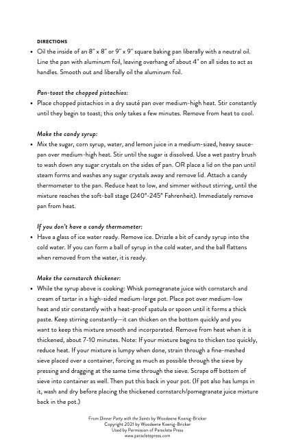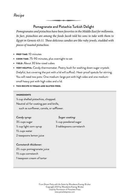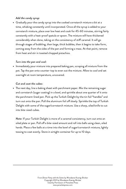 As an interesting footnote, because Celia lives in Maine and I live in Oregon, it wasn’t possible for me to taste the foods she was preparing, but she sent me a box of Turkish Delight that I hoarded like a dragon hovering over a stash of gold: “No, you may not have a piece!” I can attest that it is fabulous. Because it keeps quite well, it would be possible to make it during Lent and save it to eat at Easter. For me, the saving part would be more than enough Lenten penance.
