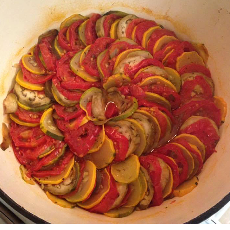 Imagine a classic French enameled cast-iron pot with alternating slices of eggplant, tomatoes, zucchini or summer squash, sweet bell peppers, and onions cooked down in extra-virgin olive oil, white wine, and seasoned with a dash of salt, slices of fresh garlic and finished off with a sprinkling of herbs de Provence.