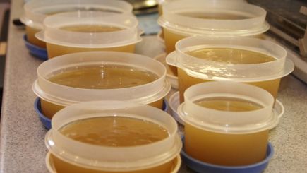 Hint: if freezing, store in multiple quart containers or sealable freezer bags. That way you can pull out only what you need when you need it. And remember not to overfill the containers as the liquid expands a bit when freezing. You wouldn’t want one of those containers to burst in your freezer!